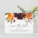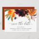 Épargnez la date de mariage bohème rustique floral avec un bouquet floral peint à l'aquarelle avec des nuances chaudes et terreuses d'orange brûlé, de terre cuite et de bordeaux profond ainsi que de la verdure. Cette Épargnez la date élégante avec les riches nuances de l'automne est idéale pour un mariage d'automne.