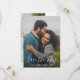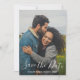 Carte de Save the Date de mariage moderne avec une conception simple avec une typographie de script élégant sur votre photo verticale préférée. Le dos comporte deux photos carrées ainsi que votre message personnel en noir et blanc.
