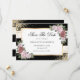 Elégant mariage floral rayé noir et blanc enregistrer la carte de date avec des fleurs rose vif et de la verdure encadrant les détails mariages à l'intérieur d'un cadre doré contre un arrière - plan noir et blanc orné de confettis dorés. Mariage floral noir et or enregistrer la carte de date.