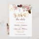 Cette carte de save the date de mariage est disponible dans des tons or pâle, rose blush, bordeaux et rose avec de beaux motifs floraux. Les polices bordeaux et or ajoutent une touche d'élégance, parfaite pour un mariage romantique. Ce design fait partie de la collection de mariage florale Blush Peony & Gold Burgundy.