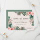 Design d'invitation de mariage moderne pour annoncer la date, avec des fleurs aquarelles rose poussiéreux et des feuilles tropicales sur fond crème. Le verso de la carte est d'une belle couleur vert sauge.