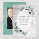 Faire-part de mariage photo de mariage géométrique à l'eucalyptus verdoyant géométrique à l'aquarelle tendance avec cadre géométrique doré et lavis aquarelle menthe au verso. Idéal pour un thème donné ou un mariage dans un jardin.