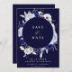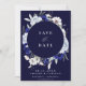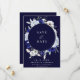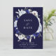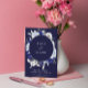 Cette carte élégante de rappel de mariage présente un fond bleu marine avec une couronne florale bleue poussiéreuse et blanche encadrant le centre. Le texte est simple et classique, utilisant une police blanche qui se démarque sur le fond sombre. Le design général est propre et sophistiqué, ce qui en fait un choix parfait pour un mariage formel ou haut de gamme.