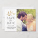 Mariage enregistrer la carte date dispose d'une branche de couleur or qui accentue ce design simple d'inspiration nature. Inclut une photo de portrait à l'avant et une photo de paysage à l'arrière avec un texte gris foncé / noir doux élégant qui peut être personnalisé.