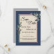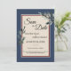 Ce mariage Pine Blue Winter save the date combine une bordure bleue carrée élégante et formelle avec d'élégantes pignons à feuillage persistant de pin pour un look classique, mais rustique. Le feuillage botanique de verdure avec type calligraphie sur un arrière - plan beige crée une ambiance naturelle pour une célébration de Noël ou de mariage en forêt.