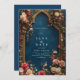 Annoncez votre jour spécial avec style avec notre carte "Save the Date" de mariage islamique floral bleu marine. Avec un fond bleu marine riche orné de motifs floraux délicats et d'accents dorés ou argentés scintillants, cette carte dégage une élégance intemporelle et donne le ton pour votre célébration de mariage islamique sophistiquée.
