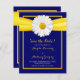 Carte de faire-part de mariage avec marguerite Shasta blanche, ruban jaune et fond bleu marine. Les couleurs sur cette carte sont bleu marine clair ou bleu roi, jaune doré et blanc. Faire-part de mariage avec marguerite blanche, jaune et bleu marine.