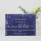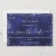 Un moderne et élégant Save the Date pour un mariage. Un arrière - plan bleu marine décoré de faux éclats d'argent. La couleur bleue est dévoilée. Personnalisez et ajoutez une date et des noms. Le texte : Save the Date est écrit avec un grand script de style à la main tendance avec des swashes. Ajoutez votre URL Web à votre propre site Web mariage à l'arrière pour créer un code QR.