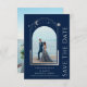 Mystique Bleu Argent Soleil Lune Star Astronomie Spatiale Galaxie cosmique Mariage Save The Dates présente un cadre soleil, lune et étoiles d'argent sur un arrière - plan bleu. A l'intérieur est votre photo préférée et votre personnalisation enregistrer les informations de date. Ajoutez une photo supplémentaire au verso. Personnalisez en modifiant le texte dans les zones de texte. Conçu pour vous par ©2022 Evco Studio www.zazzle.com/store/evcostudio