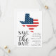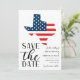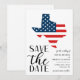 Mariage de destination texan patriotique, enregistrez la date avec un État américain et une illustration de drapeau.