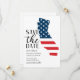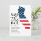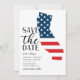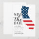Mariage de destination en Californie avec une illustration de l'État et le drapeau des États-Unis pour annoncer la date à retenir.