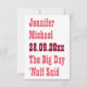 "Mariée. Marié. Date du mariage. Le Grand Jour. C'est tout dit." Une carte d'invitation de mariage personnalisée, drôle, amusante, cool, blanche et simple pour annoncer la date de votre mariage. Personnalisez la carte avec la date de votre mariage, le lieu de la cérémonie (ville et état), ainsi que les noms des mariés. Une invitation save the date idéale, drôle, originale, hilarante et humoristique pour tous vos amis, famille et proches. Une invitation amusante pour la mariée et le marié à envoyer en tant que couple.