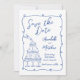 Cadre de tournage en bleu et blanc d'inspiration européenne Enregistrer la carte de date. Cette carte fantaisiste et créative, inspirée par l'élégance italienne, française et européenne, est parfaite pour les couples qui veulent donner un ton ludique mais raffiné à leur prochain mariage. Conçue dans une palette classique bleu et blanc, la carte dispose d'un cadre tourbillonnant avec des détails de coeur qui entourent vos informations mariages, présenté dans un charmant mélange de script et de polices manuscrites de style pour une sensation décontractée et sophistiquée. Une illustration vivante d'une tour en verre de champagne avec une bouteille coulant de mousseux sur le dessus ajoute une touche festive et artistique au coin inférieur gauche. Ce détail enchanteur se marie harmonieusement avec le cadre pivotant, créant un design à la fois unique et mémorable. L'arrière de la carte dispose d'un espace pour présenter une photo du couple, ajoutant une touche personnelle et chaleureuse. Un subtil monogramme des initiales du couple est élégamment placé à proximité, se mélangeant harmonieusement avec le design pour une finition raffinée. Entièrement personnalisable, cette carte "save-the-date" est idéale pour les couples à la recherche de quelque chose de design, de tendance et de personnalité. Disponible en version imprimée ou sous forme de fichier numérique téléchargeable pour un partage aisé ou une impression locale.