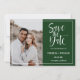 "Sauvegarder la date" apparaît en typographie script blanche sur fond vert foncé.