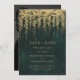 Une illustration de branches d'arbres avec une verdure luxuriante et sauvage et un feuillage suspendu, superposée numériquement avec de l'or, sur un fond vert émeraude scintillant, décore cette invitation de mariage "save the date" de printemps, été, automne ou hiver avec un thème de forêt enchantée. Un "save the date" élégant et moderne pour un mariage de conte de fées. Parfait pour les mariées qui aiment le cadre de la forêt de conte de fées, le thème de la forêt des fées ou du jardin des fées ainsi que le vert émeraude et l'or.