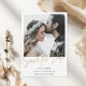 Faites une première impression glamour avec notre carte de Mariage photo de calligraphie dorée moderne Enregistrez la date. Ce design équilibre parfaitement le minimalisme contemporain avec une touche de luxe, mettant en vedette votre photo de fiançailles préférée surimposée d'une élégante écriture dorée à la main. (effet couleur or imprimé) C'est une façon chic et sophistiquée d'annoncer votre date à vos amis et à votre famille.