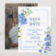 Belles pointes de delphinium peint art botanique bleu et photo sur mariage inverse enregistrer l'invitation de date. Éditez ceci enregistrez la carte mariage date avec vos propres mots et photo spéciale. Design unique et poêle peint à la main d'origine aquarelle fine fleur art par Sarah Trett exclusivement pour www.mylittleedenweddings.com sur Zazzle.