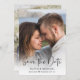 Ce mariage de deux photos, sauf la carte de date est simple et élégant, avec une photo du couple de chaque côté, et tendance écriture manuscrite superposition de police sur le devant.