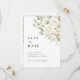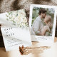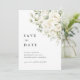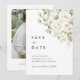 Un design raffiné de carte "save the date" à motif floral vert sauge et blanc, présentant des fleurs aquarelles douces et une mise en page élégante avec photo au verso.