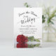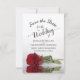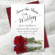 Ce mariage Save the Date card est romantique, élégant, classe et belle. Il présente une photo d'une seule rose rouge à longue tige réfléchissant dans un bassin d'eau avec des vagues et des ondulations. Le texte est une calligraphie de script sophistiquée sur un arrière - plan blanc. Le dos est doté d'un motif roux ou bordeaux foncé. Une façon idéale de faire connaître votre prochain mariage à vos amis et à votre famille.