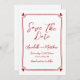 Mariage rouge tiré à la main Enregistrer le Faire-part de mariage de la date.Cette simple carte minimaliste d'inspiration italienne ou française sauvegarde la carte de date présente un design propre avec un cadre dessiné à la main subtil avec des coeurs rouges dans chaque coin. Le cadre encercle délicatement vos informations de mariage, en utilisant un simple mélange élégant de scripts et de polices de style manuscrites, le tout en rouge contre un arrière - plan blanc. Sur le dos, vous trouverez un monogramme personnalisé des initiales du couple. Ce design offre un look ludique frais avec une touche de charme et est entièrement personnalisable pour convenir à votre style. Parfait pour les couples qui recherchent un design à la fois sobre et tendance. Disponible sous forme de carte imprimée ou de téléchargement numérique pour un partage aisé ou une impression locale.