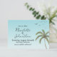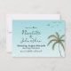 Ces annonces personnalisées de Save the Date présentent un thème tropical pour une destination ou un simple mariage à la plage. Une image d'un palmier est représentée à droite, avec une volée d'oiseaux volant au-dessus. Le fond est un dégradé de bleu ciel. Les noms des mariés sont imprimés à gauche dans une police de caractères élégante, suivis de la date et du lieu du mariage.