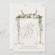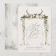 Faire part de mariage avec dais rustique à conserver. Avec de beaux feuillages à l'aquarelle, des fleurs blanches, des bois de cerf, des rideaux de tulle et une écriture manuscrite. Cette invitation de mariage moderne est sûre de définir le style de votre mariage à venir.