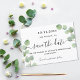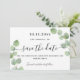 Un moderne et élégant Save the Date pour un mariage. Un blanc orné de tiges de verdure d'eucalyptus, sprigs. Personnalisez et ajoutez une date et des noms. Le texte : Save the Date est écrit avec un grand script de style à la main tendance. Retour : arrière - plan vert