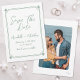 Simple Levé à la main Sage Whimsical Mariage vert Enregistrer la date. Cette carte Sauvez la Date d'inspiration européenne présente un design épuré et minimaliste, parfait pour les couples à la recherche d'une élégance intemporelle. Un cadre dessiné à la main avec de charmants coeurs verts sauge dans chaque coin encercle délicatement vos détails mariages, présentés dans un mélange de scripts et de polices manuscrites pour un look à la fois élégant et personnel. Le dos de la carte comprend de l'espace pour une photo du couple, ajoutant une touche personnelle et chaleureuse. A côté de la photo, un monogramme personnalisé des initiales du couple est placé élégamment, se mélangeant harmonieusement avec le design pour créer une finition raffinée. Inspiré par l'esthétique européenne classique avec des touches de charme italien et français, ce design est entièrement personnalisable pour correspondre à votre thème mariage. Qu'il soit imprimé ou partagé numériquement, il offre une façon sophistiquée mais ludique d'annoncer votre journée spéciale.