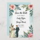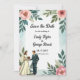 Cette élégante aquarelle fleurie à sauver la date invitation est parfait pour un mariage moderne. Le design romantique présente un cadre floral aquarelle élégant avec une illustration de mariée et de mariée et de calligraphie noire sur un arrière - plan blanc.