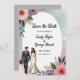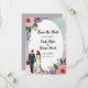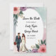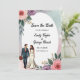Cette élégante aquarelle fleurie à sauver la date invitation est parfait pour un mariage moderne. Le design romantique présente un cadre floral aquarelle élégant avec une illustration de mariée et de mariée et de calligraphie noire sur un arrière - plan blanc.