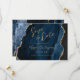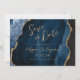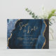 Ce mariage élégant enregistrer la carte date dispose d'une image arrière - plan d'agate bleu marine aquarelle taillée avec une parties scintillant en faux or. Le texte personnalisable combine écriture manuscrite moderne couleur or, cuivre et polices italiques. L'envers présente un design coordonné d'agate bleu marine et or.