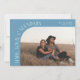 Modern and stylish save the date card featuring a text that says "mark your calendars" along the curved frame photo. One photo in the front and one on the back. The background is denim blue.