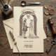 Capture the spirit of a medieval romance with this exquisitely designed 'Save the Date' card. Featuring a dramatic gothic arch and a symbolic dragon, the illustration portrays a knight and his bride ready to begin their lifelong journey. The rich detailing and classic aesthetic make this card a perfect prelude to a wedding steeped in history, fantasy, or a gothic ambiance. It's more than just an announcement; it's a piece of art that foreshadows the magical day to come.