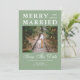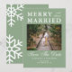 This minimalist merry and almost married save the date doubles as a holiday card from an engaged couple. The design features classic typography against a green background with snowflakes. Photo template via Pixabay licensed under CC0 and must be replaced with your own photo