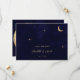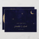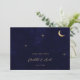 Une faire-part de mariage céleste moderne minimaliste présente un design simple et élégant. Il comprend une lune de feuille d'or et des étoiles qui brillent doucement, dressé contre un arrière - plan bleu nuit. L'invitation utilise la typographie serif classique, qui ajoute une touche traditionnelle et formelle avec son style soigné et clair.