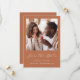 Cette simple et minimaliste carte Save the Date présente une photo carré au-dessus des mots "Save the Date" dans un élégant script d'écriture manuscrite blanche, suivie des noms du couple, date du mariage et ville en sans serif font sur un arrière - plan en terre cuite. Ajoutez un message plus détaillé avec des informations supplémentaires sur l'inverse, ainsi qu'un code QR qui envoie les invités à votre site Web mariage.