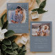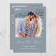 Cette simple et minimaliste carte Save the Date présente une photo carré au-dessus des mots "Save the Date" dans un élégant script d'écriture manuscrite blanche, suivie des noms du couple, date mariage et ville en sans serif police sur un arrière - plan bleu poussiéreux. Ajoutez une seconde photo horizontale et un message plus détaillé avec des informations supplémentaires sur l'inverse.