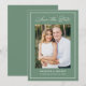 Announce your wedding in style with this modern photo wedding save the date, featuring a deep sage green background, white calligraphy script, and a coordinating white border. Your vertical photo is centered within the design, with your names, wedding date, and location displayed below in clear, easy to read lettering. This modern wedding save the date is ideal for garden weddings, outdoor ceremonies, and spring or summer weddings. The back is blank, giving you space to add a wedding website and additional photos.