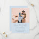 This photo save the date puts your favorite couple photo front and center, with names, wedding date, location, and website displayed below in a soft blue color combination that feels bold, modern, and completely celebratory.