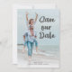 Mariage moderne, élégant et amusant Enregistrer le carte photo de date avec une police de script de brosse mignonne. Ajoutez des photos à l'avant et à l'arrière de cette carte.