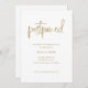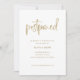 Ce mariage moderne change la carte de date et propose une typographie manuscrite en faux or tendance qui dit "reportée" sur un arrière - plan blanc. Une façon simple et élégante d'annoncer avec style que votre mariage a été reprogrammé.