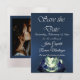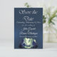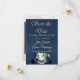 Montagnes aquarelle Enregistrez la date présente des montagnes majestueuses aquarelle dans des nuances de bleu et de vert sur un fond de satin bleu avec des espaces réservés pour les informations. Un espace pour une photo du couple de mariés est au dos de la carte. Pour modifier les détails, cliquez sur « Personnaliser ». Pour déplacer le texte ou modifier la taille, la police ou la couleur du texte, cliquez sur « Cliquez pour personnaliser davantage »