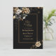 Informez vos amis et proches de votre prochain mariage avec cette élégante carte de mariage floral noir et or. Cette carte présente un arrangement de roses noirs, or et crème et de bokeh en or doux dans l'arrière - plan derrière les fleurs en ajoutant une touche de fantaisie. Enfermé dans une simple bordure dorée, le texte personnalisable vous permet d'ajouter vos propres informations à la carte.