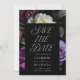 Un mariage floral élégant et humoristique sauve les dates avec un arrière - plan de fleurs violettes, ivoire et bordeaux avec un feuillage vert luxuriant sur un arrière - plan noir. "Save The Date" s'affiche dans une typographie moderne et élégante. Personnalisez la floraison violette enregistrez les dates avec vos noms, date mariage et emplacement. La carte inverse pour afficher votre photo fiançailles verticale encadrée en noir avec un motif floral violet. Le design s'harmonise avec notre collection Moody Gothic Floral mariage.