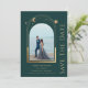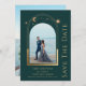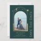 Mystical Green Gold Sun Moon Stars Space Galaxy Celestial Cosmos Astronomie Save The Dates dispose d'un soleil doré, lune et étoiles cadre sur un arrière - plan vert. A l'intérieur est votre photo préférée et votre personnalisation enregistrer les informations de date. Ajoutez une photo supplémentaire au verso. Personnalisez en modifiant le texte dans les zones de texte. Conçu pour vous par ©2022 Evco Studio www.zazzle.com/store/evcostudio