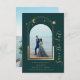 Mystical Green Gold Sun Moon Stars Space Save The Dates dispose d'un soleil doré, de lune et d'un cadre étoiles sur un arrière - plan vert. A l'intérieur est votre photo préférée et votre personnalisation enregistrer les informations de date. Ajoutez une photo supplémentaire au verso. Personnalisez en modifiant le texte dans les zones de texte. Conçu pour vous par ©2022 Evco Studio www.zazzle.com/store/evcostudio
