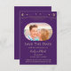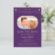 Mystical Purple Gold Sun Moon Star Space Save The Dates dispose d'un cadre de soleil doré, de lune et d'étoiles sur un arrière - plan violet. A l'intérieur est votre photo préférée et votre personnalisation enregistrer les informations de date. Personnalisez en modifiant le texte dans les zones de texte. Conçu pour vous par ©2022 Evco Studio www.zazzle.com/store/evcostudio