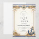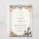 This elegant nautical wedding design features classic maritime elements including a compass rose, knotted rope, seashell details, and a timeless anchor accent. Set against a soft neutral background with navy and gold touches, the composition feels refined, coastal, and romantic without being overly themed. Perfect for seaside weddings or couples who love subtle nautical symbolism with a polished, timeless aesthetic.