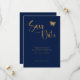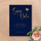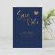 Annoncez votre journée spéciale avec notre élégante carte "Navy Blue & Gold Script : Parties scintillant Butterfly Wedding Save the Date". Ce design sophistiqué présente un arrière - plan bleu marine, orné d'un script doré luxueux et d'une typographie dorée moderne pour des noms, des dates et des détails personnalisés. Des motifs de papillons délicats dans une parties scintillant dorée chatoyante ajoutent une touche de charme et d'élégance. Parfait pour les couples à la recherche d'un faire-part mariage élégant et unique qui séduira leurs invités. Faites de votre mariage une journée mémorable grâce à ce design personnalisable et luxueux.